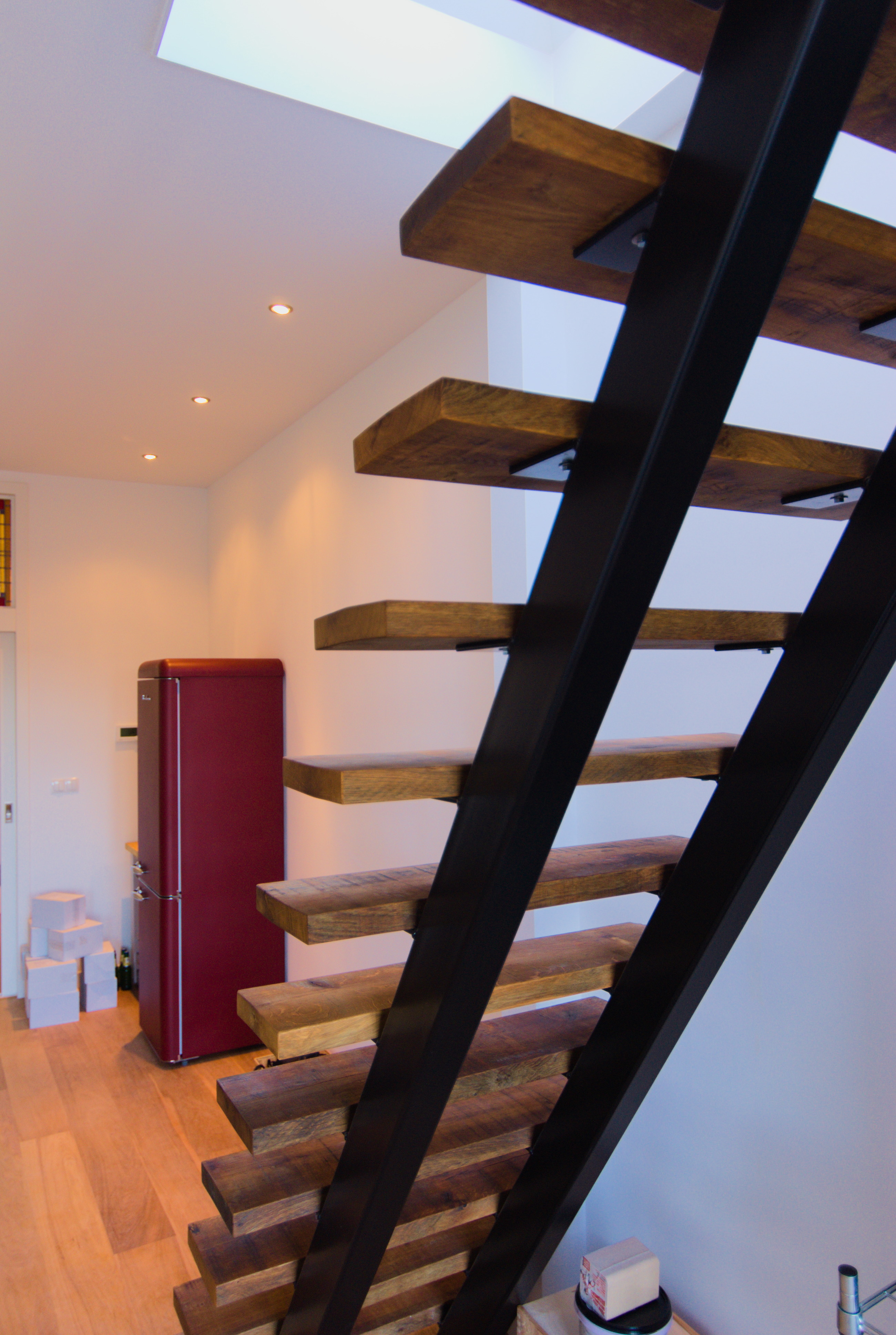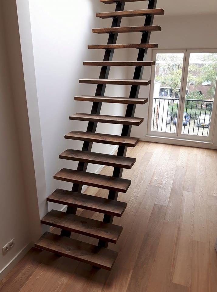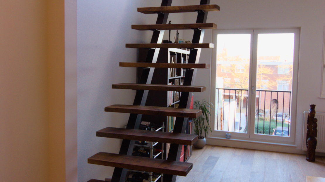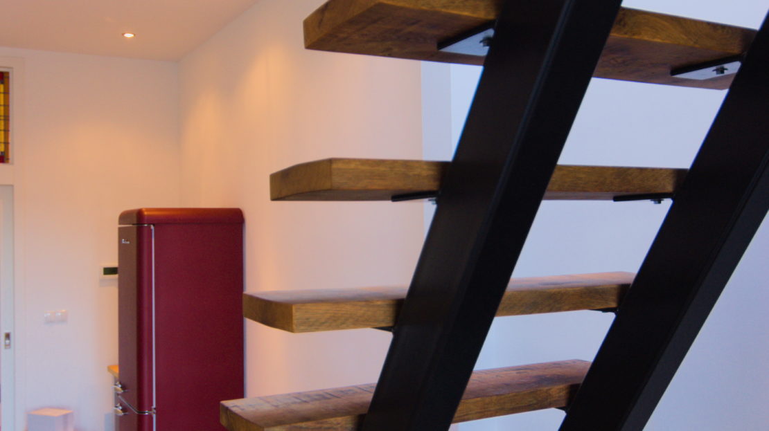 Designertrap van staal en oud eikenhout