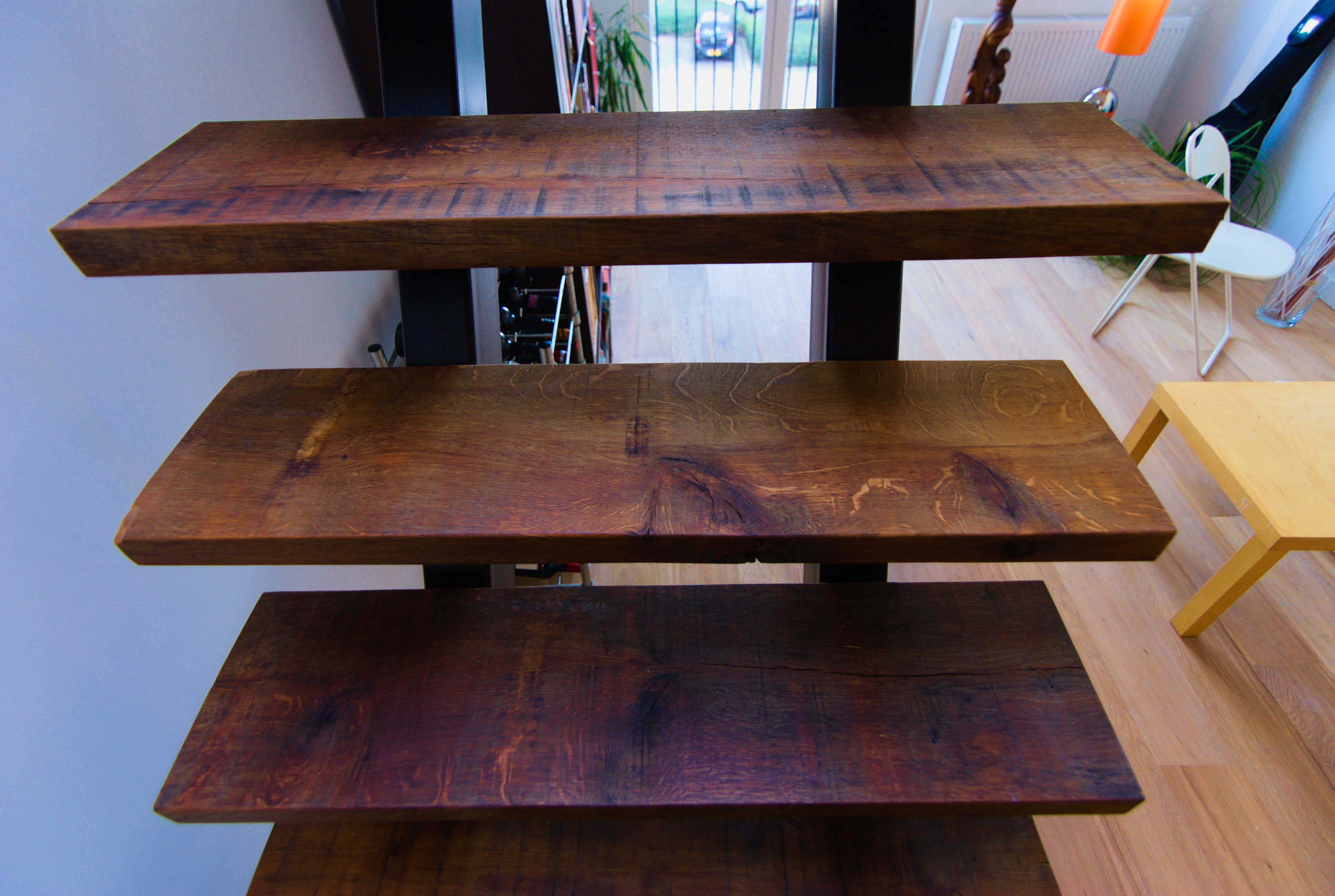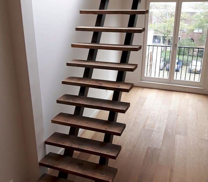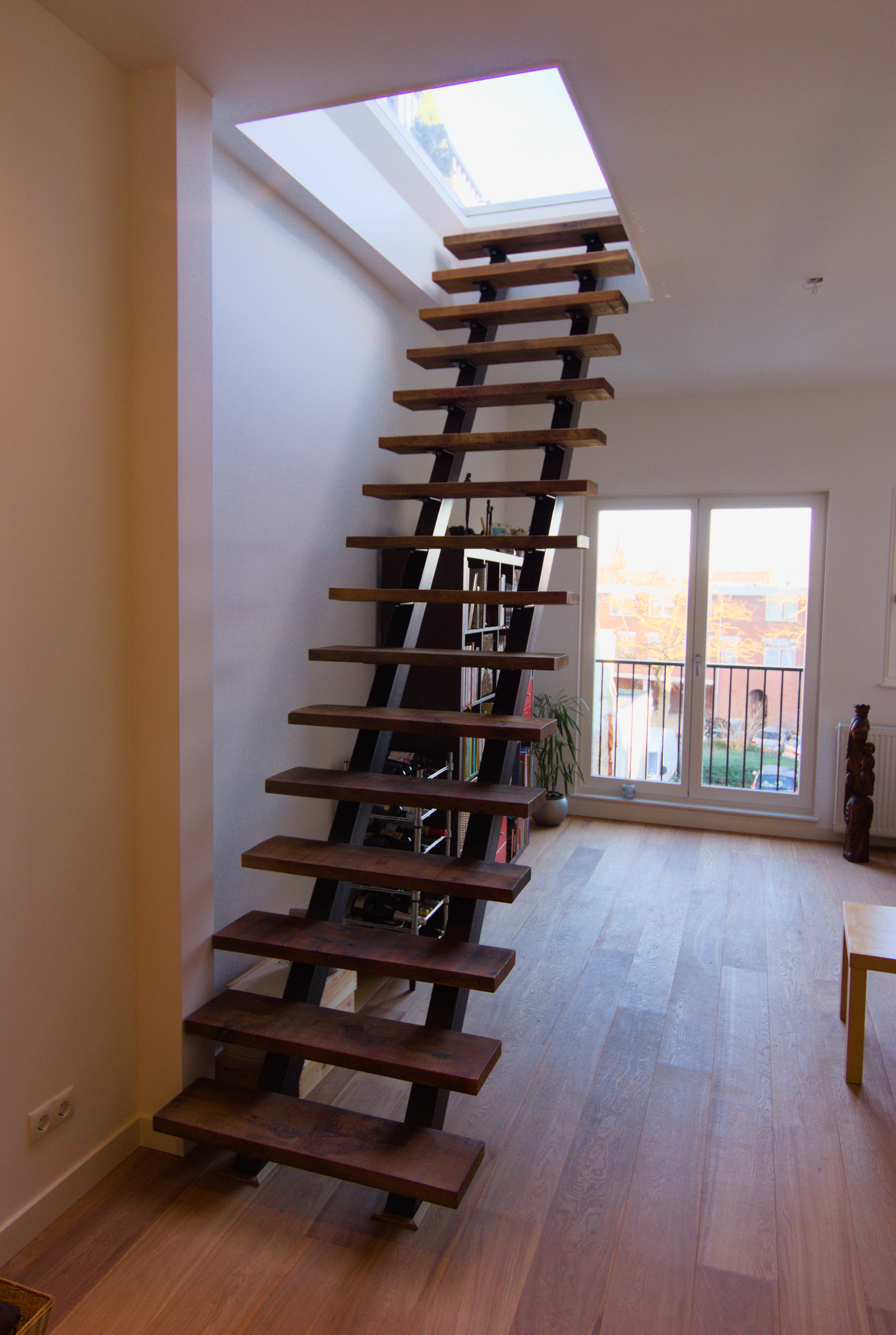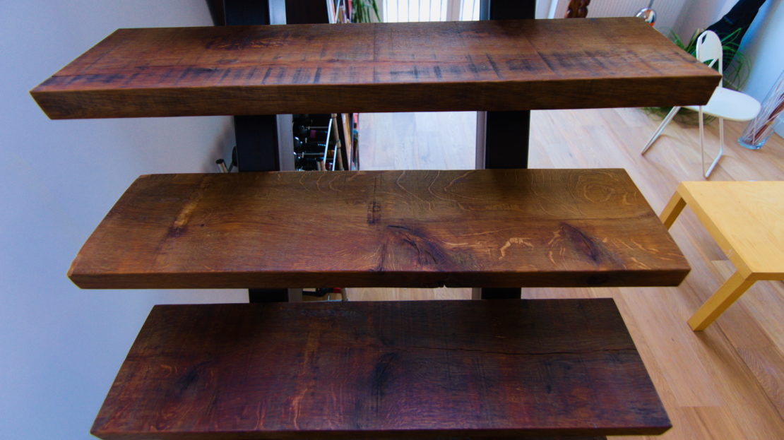 Designertrap van staal en oud eikenhout